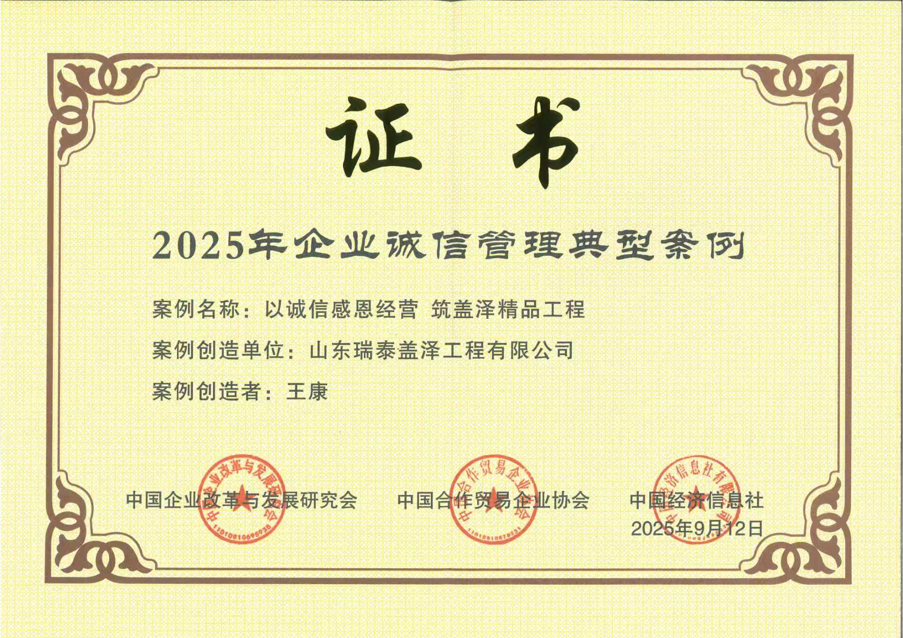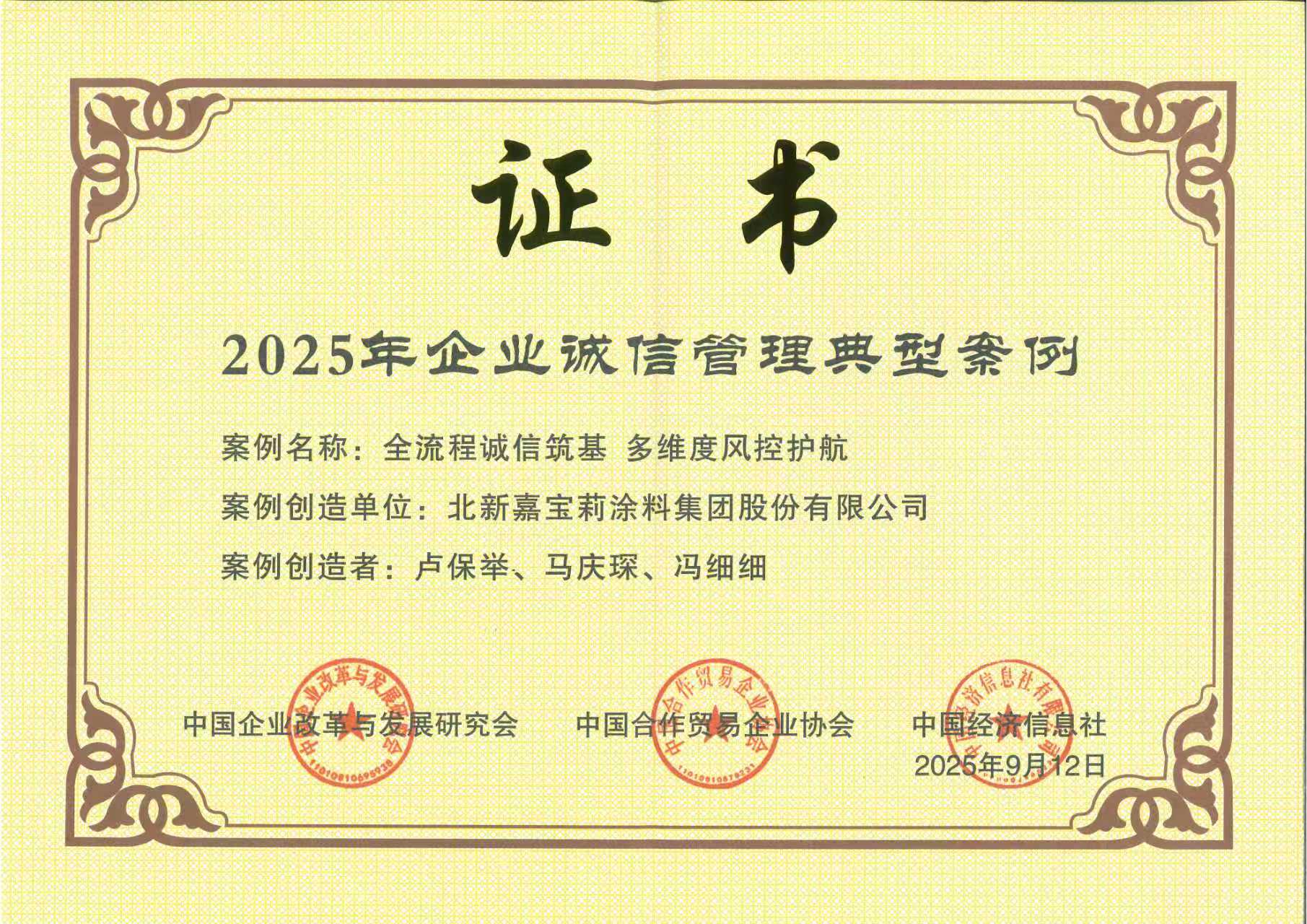 9月27日,中國企業(yè)改革與發(fā)展研究會(huì)、中國合作貿(mào)易企業(yè)協(xié)會(huì)主辦的“2025年企業(yè)誠信建設(shè)高質(zhì)量發(fā)展大會(huì)”在福州舉行。中國建材集團(tuán)入選“2025年培育誠信經(jīng)營守信踐諾標(biāo)桿企業(yè)倡議單位”,集團(tuán)所屬中材節(jié)能股份有限公司、北新嘉寶莉涂料集團(tuán)股份有限公司、山東瑞泰蓋澤工程有限公司的案例榮獲“2025年企業(yè)誠信管理典型案例”。